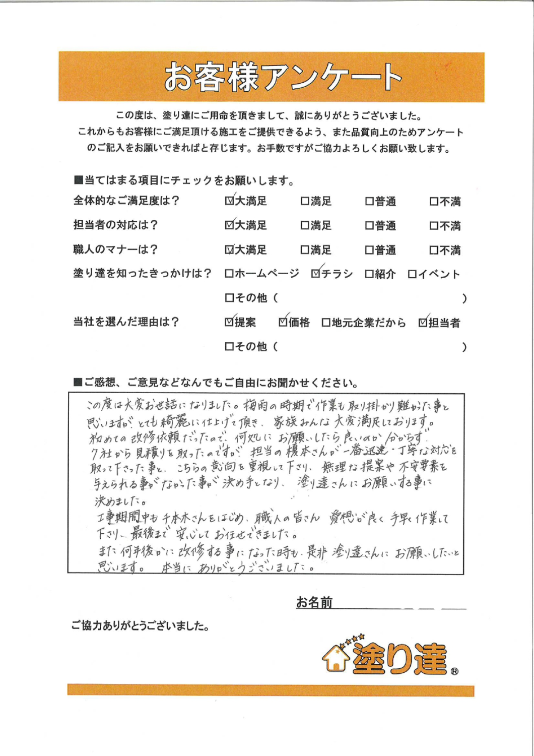 梅雨の時期で作業も取り掛かり難しかった事と思いますが、とても綺麗に仕上げて頂き、家族みんな大変満足しております。