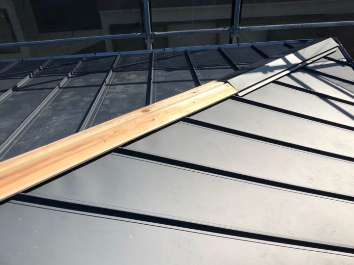 新しい屋根材として立平を葺いていきます。棟板金設置