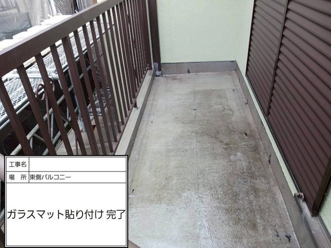 防水層の強度と耐久性を高めるために、プライマー処理後の下地にガラス繊維シートを均一に敷き込む工程です。