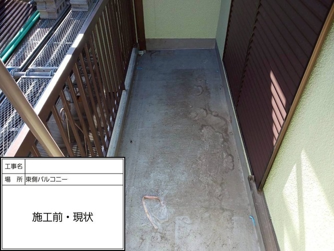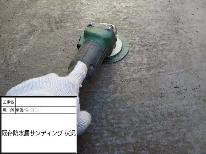 古い防水層の表面を研磨して汚れ・劣化膜・凹凸を取り除き、新しい防水材が密着しやすい状態に整える作業です。