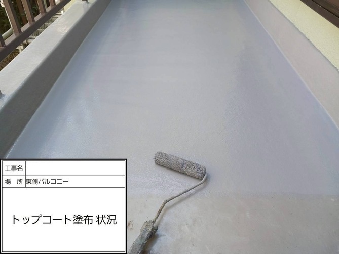 完成した防水層の表面に保護膜を形成し、紫外線・雨水・摩耗などから防水層を守るための最終工程です。