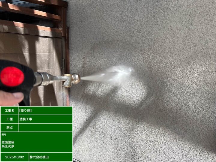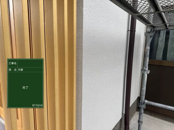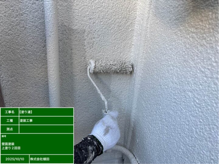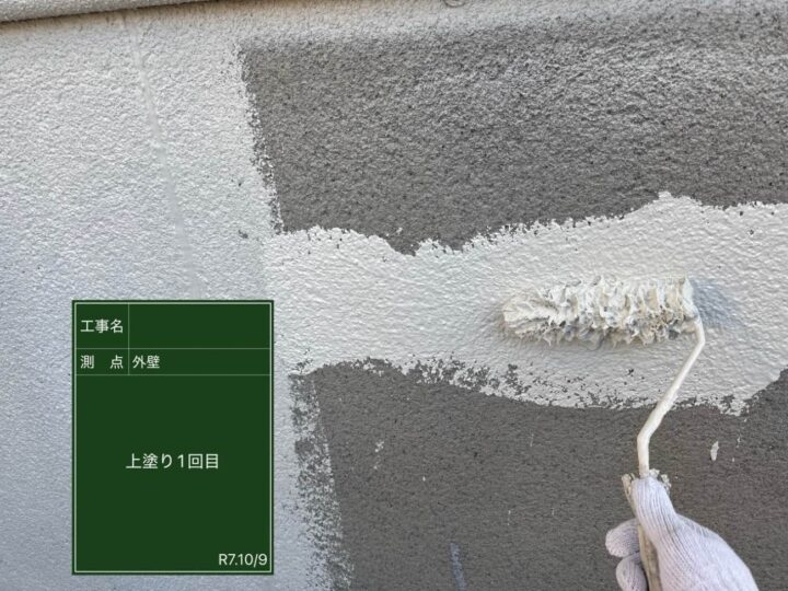 外壁塗装の上塗り1回目は、下塗りで整えた下地に塗料を塗布し、塗膜の厚みと密着性を確保する工程です。仕上げの均一な色合いや耐候性を支える基礎層を形成します。
