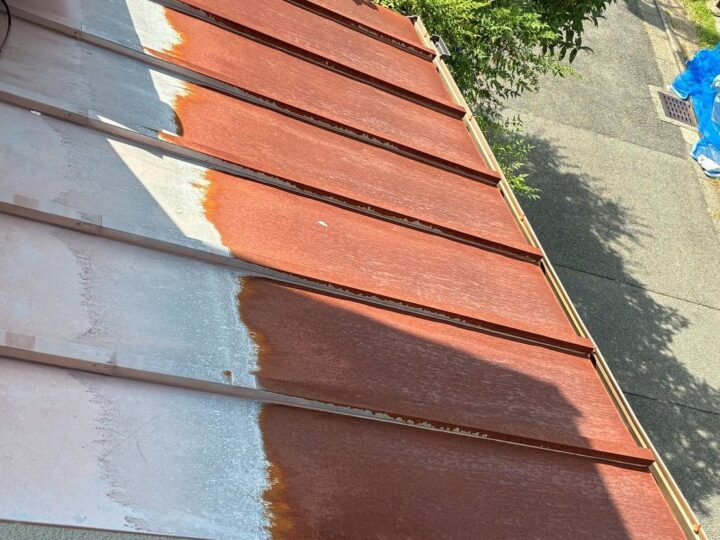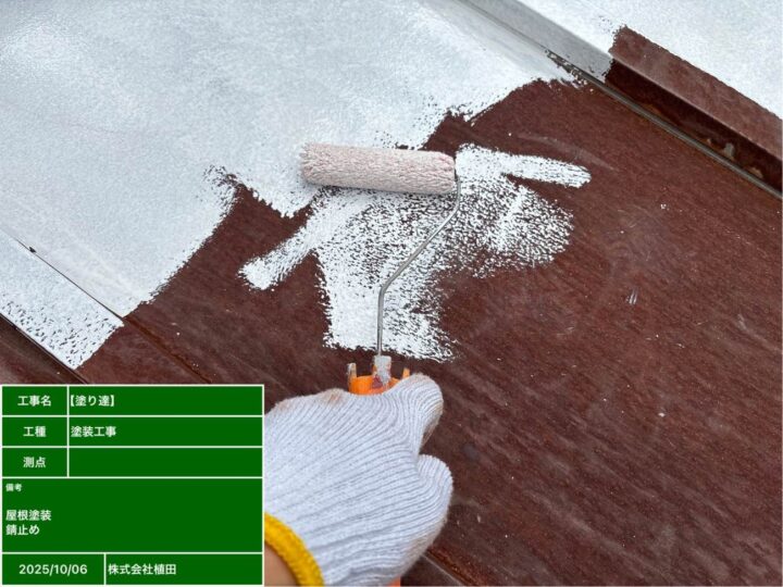 瓦棒部分の下塗りでは、防錆効果のある下塗り材を塗布し、サビの進行を抑えながら上塗り塗料の密着性を高めます。