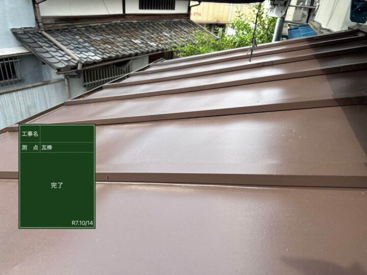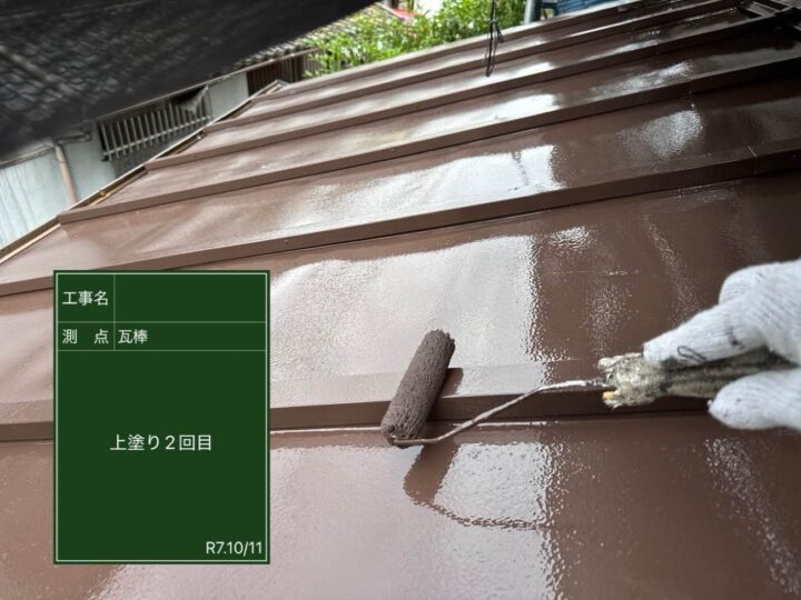 瓦棒部分の上塗り2回目では、塗膜に十分な厚みを持たせ、仕上がりの美観と耐久性をさらに高めます。