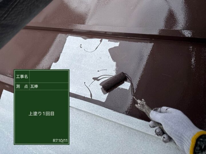 瓦棒部分の上塗り1回目では、下塗り層を保護しつつ色ムラを抑えながら、耐候性・防錆性を高めるため均一に塗装します。