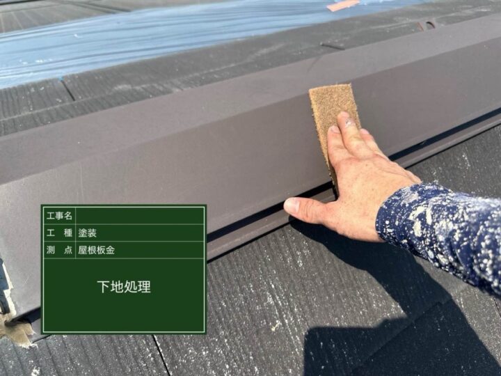 屋根板金の下地処理は、サビや汚れをケレン作業で丁寧に除去し、塗料の密着性を高めるために行います。