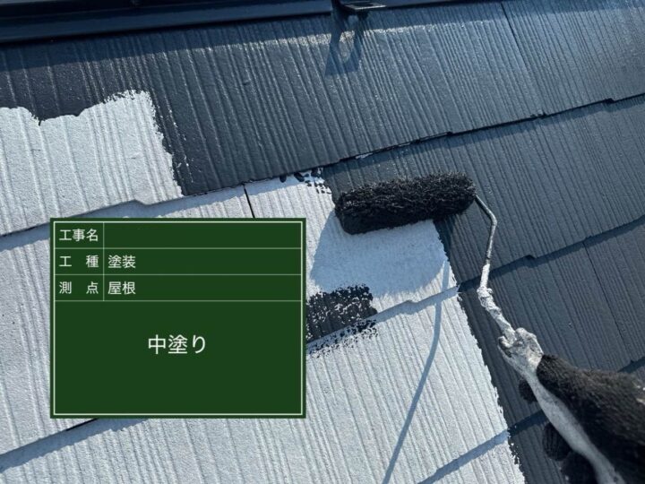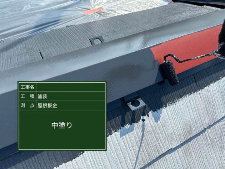 屋根板金の中塗りは、上塗りの仕上がりを良くするための下地調整と塗膜厚の確保を目的として行います。